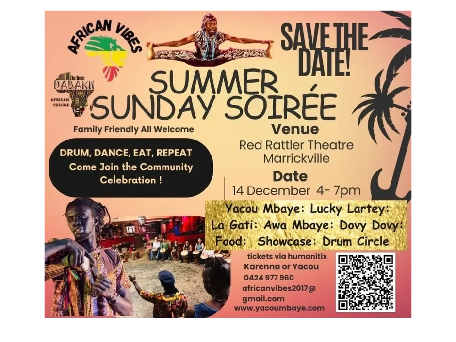Join us for the African Vibes Community Celebration at Red Rattler Theatre. Not to be missed! 4pm - 7pm Drum workshop at 4.15pm Family friendly! Tickets via Humanitix